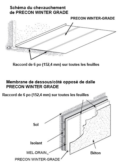 PRECON WINTER GRADE peut être employé avec un étaiement de murs en caisson sans utiliser de panneaux de drainage, tels que MEL-DRAIN de W. R. MEADOWS. W. R. MEADOWS recommande le drainage du site bien que celui-ci ne puisse pas être effectué de manière efficace dans certaines conditions de chantier. La décision de retirer les panneaux de drainage devrait être à la discrétion de l’ingénieur. Si le système de drainage n’est pas installé, la préparation de la surface est importante. Le substrat a besoin d’être solide, sain et lisse. Tout espace ou vide de plus de 25 mm (1 po) doit être bouché. Lorsque PRECON WINTER-GRADE est employé avec MEL-DRAIN de W. R. MEADOWS, le système peut recouvrir les espaces de moins de 50,8 mm (2 po). Cependant, les espaces de plus de 50,8 mm (2 po) doivent être bouchés.