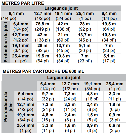 Ces taux de couverture sont estimés et varieront selon les conditions du chantier. Les valeurs indiquées tiennent compte d’une perte de matériau de 10% à cause de l’excès de remplissage.