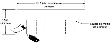 - Découper un morceau de PERMINATOR d’au moins 30,5 cm (12 po). La longueur devrait être égale à une fois et demie la circonférence du tuyau. Découper des languettes sur la moitié de la largeur du film à l’aide d’un couteau à couvreur ou de ciseaux.